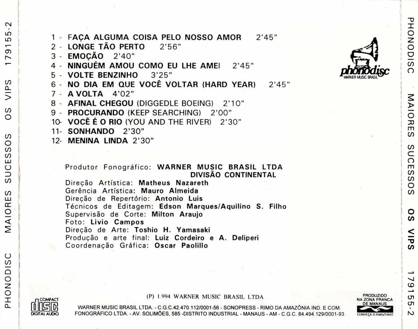 Primeira compilação da dupla "Os Vips" lançada em CD em 1994 pelo selo Phonodisc da gravadora Warner Music Brasil contendo 12 faixas de sucessos da sua carreira. Foi acrescentada pelo blogspot mais 12 faixas como bônus track para dar uma incorporada na obra da excelente dupla da Jovem Guarda. Vivam estes maravilhosos momentos mágicos.